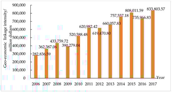 The intensity of the geo-economic linkages between China and MSRCs was measured by the geo-economic flow linkage intensity model, and it was found that the intensity of geo-economic linkages between China and the MSRCs rose from 282,836.59 million dollars in 2006 to 833,803.57 million dollars in 2017 (Figure 2). This shows that the geo-economic ties of China and the MSRCs continue to strengthen, further enhancing bilateral geo-economic relations. According to the growth characteristics of the intensity of geo-economic linkages, the changes in the geo-economic relations between China and the MSRCs can be divided into the initial period of development (2006–2008), the period of rapid growth (2009–2013), and the period of consolidation and strengthening (2014–2017). In the early stage of development, China was in a period of rapid economic growth, foreign investment and foreign trade exports continued to rise, the intensity of geo-economic flow ties rose to 433,759.72 million dollars, and bilateral geo-economic relations achieved rapid development. In the period of rapid growth, China’s economy was shifting from high speed to medium-low speed growth. Its exports continued to grow, and outbound investments increased. During this period, the average annual growth rates of total trade flows and investment flows between China and the MSRCs reached 16.15% and 17.40%, respectively, which led to a rapid increase in the intensity of bilateral geo-economic flows, reaching 660,057.83 million dollars in 2013. In the period of consolidation and strengthening, China has actively promoted the construction of the Belt and Road, and the MSRCs have become key regions of China’s geo-economic development—further strengthening bilateral economic and trade cooperation, increasing China’s investment in the regions along the routes, and enhancing the linkage intensity of geo-economic flows.