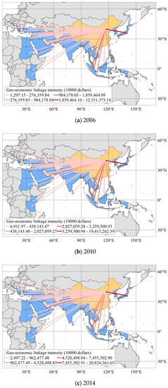 The geo-economic linkages between China and other countries in the region are far less intense than those with regional powers such as Japan, South Korea, India, and Saudi Arabia (Table 2). Taking Japan as an example, the intensity of China’s geo-economic linkage with Japan was far greater than that with nearby North Korea and South Korea from 2006 to 2017. In 2017, the intensity of China–Japan geo-economic flows reached 216,048.90 million dollars, accounting for 25.91% of the total intensity of geo-economic flows. In 2017, the intensity of China–Japan geo-economic flows reached 216,048.90 million dollars, accounting for 25.91% of the total intensity of geo-economic flows. The relative intensity of China and Japan’s geo-economic linkage has always been more than a quarter, far higher than those of other countries, although its proportion is declining, indicating that Japan’s geo-economic status is particularly important. From 2006 to 2017, the ratio of China–Singapore geo-economic linkage intensity to total geo-economic linkage intensity was greater than 5%, and the geo-economic linkage intensity between China and India was greater than those of Pakistan, Sri Lanka, and Bangladesh. In addition, the intensities of the geo-economic linkages between Saudi Arabia in Western Asia and Egypt in Africa and China were greater than those of other countries in the regions. From 2006 to 2017, the total intensities of the geo-economic linkages between China and Japan, Singapore, Saudi Arabia, India, and Egypt accounted for more than 38%, reaching 55.44% in 2006. These figures show that regional powers play an important role in the process of geo-economic cooperation between China and the MSRCs. In the future, geo-economic cooperation between China and the MSRCs should be oriented toward regional powers. It is worth noting that although relevant studies have emphasized that China’s geo-economic linkages have a geographical proximity effect [54], technological progress and transportation advances have made the impact of distance on geo-economic interaction weaker and weaker, and the geographical proximity effect of China’s geo-economic linkage with MSRCs is only significant in a few countries.
