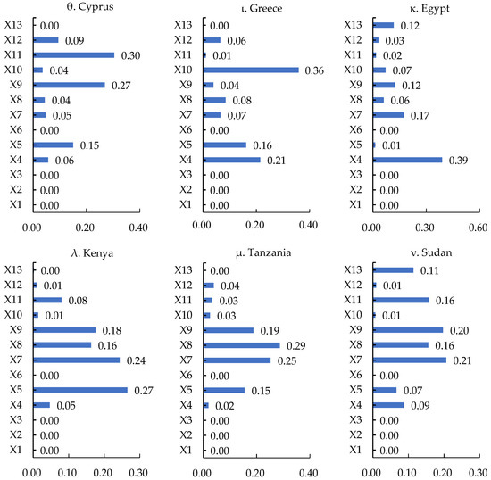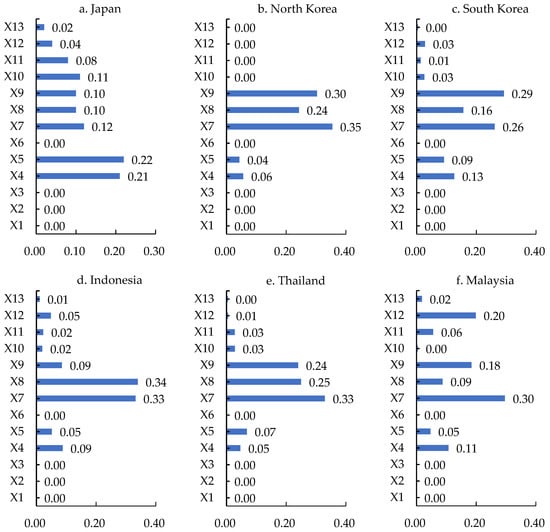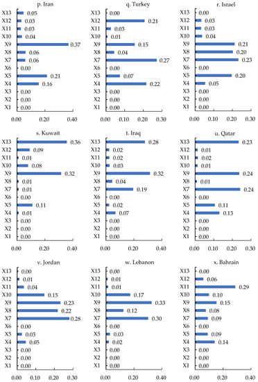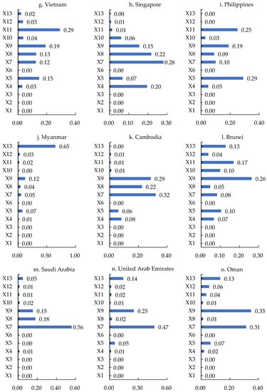 The geopolitics indices, market indices, and resource indices play key roles. Among the types of indices affecting the geo-economic linkages between China and Japan, the Philippines, Kenya, and Pakistan, the cooperation goldenstein factor is the most important, whereas for China and Egypt, the conflict goldenstein factor is the most important. Due to the prominent position of geopolitics, the geo-economic relations between China and these countries are very sensitive to bilateral geopolitical exchanges. Among the types of indices that affect the geo-economic relations between China and North Korea, Thailand, Malaysia, Singapore, Cambodia, Saudi Arabia, the United Arab Emirates, Turkey, Israel, Qatar, Jordan, Bangladesh, and Sudan, the most important is GDP (Figure 4). For China and Brunei, South Korea, Oman, Iran, Iraq, Slovenia, Croatia, and Albania, population is the most important, whereas for China and Indonesia, India, and Tanzania, the most important is gross domestic product per capita (Figure 4). The market indices are powerful driving forces for China and these countries to develop geo-economically and form close geo-economic linkages in global trade, investment, and production networks. Among the types of indices affecting China’s geo-economic relations with Kuwait, Myanmar, Yemen, and Syria, the most important is the value of oil and gas exported to China (Figure 4). For China, as well as Sri Lanka and Greece, the most important is the percentage of fuel exports as a percentage of commodity exports. For China and Cyprus, Vietnam, and Bahrain, the most important is the total rental value of natural resources. These countries are rich in mineral, oil, and gas resources and agricultural products, and export large amounts of resource products to China, forming a stable flow of trade and resources and promoting sustainable bilateral geo-economic development.