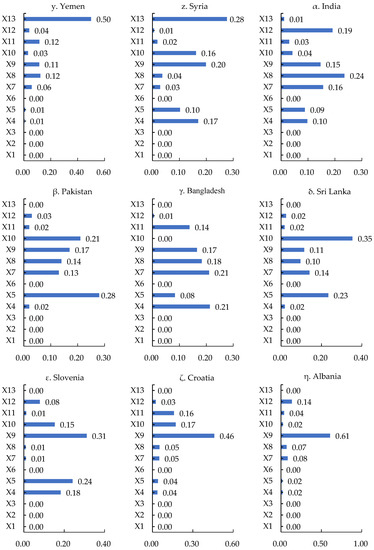 According to the geo-economic relation type indices’ importance for China and the MSRCs, it can be seen that the dominant elements affecting the geo-economic relations between China and the MSRCs are significantly different (Figure 4). In terms of indices, the top indices of different countries are not uniform. GDP, per capita GDP, the value of oil and gas exported to China, the total rent of natural resources, and the cooperative goldenstein factor all appear as the most important indices. GDP and population are the most important characteristics overall of the geo-economic relations between China and the MSRCs. There are 12 countries with GDP as the most important, and 9 countries with population as the most important. This shows that national economy size and market are particularly important in geo-economic linkages, and these are the top indices for the development of geo-economics between China and many MSRCs. Other important indices that appear frequently are the cooperative goldenstein factor, the value of oil and gas exported to China, and the export of ore and metal, which means that geopolitical cooperation, ore resources, oil, and gas resources are of great significance to the geo-economic development of China and the MSRCs. The importance of each of the indices of the distance between the capitals of the countries, whether the boundary is adjacent, and shipping time is 0, which shows that distance has a very weak effect on the geo-economic relations between China and the MSRCs and is not a major obstacle to China’s geo-economic development. In terms of importance values, the maximum value of importance is 0.65, accounting for 65% of the importance of all indices in the country, indicating that this individual index plays a decisive role in the development of the geo-economy in a few countries and China. For example, oil and natural gas from Myanmar and Yemen are exported to China. The differences in geographic location, natural resource endowments, geopolitical relations, and market size among various countries have led to large fluctuations in the importance of the indexes in various countries. For example, the importance of the cooperative goldenstein factor varies greatly across countries, with that of the Philippines being 108 times that of Saudi Arabia (Figure 4).