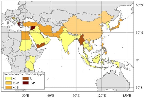Types of geo-economic relations between China and the MSRCs. Note: The map is a drawing is based on the standard map of GS (2016) 1667 that comes from the standard map service system of the Ministry of Natural Resources of the People’s Republic of China (http://bzdt.ch.mnr.gov.cn/index.html, accessed on 3 October 2022).