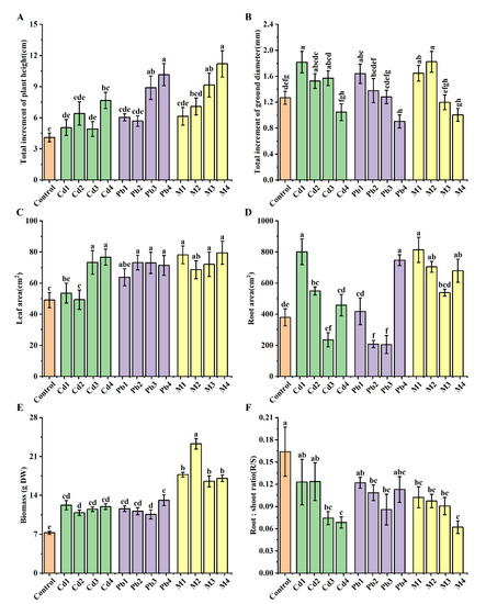 Effects of single Cd/Pb and Cd + Pb combined stress on growth indexes of B. racemosa seedlings. (A) Total increment of plant height (cm); (B) total increment of ground diameter (mm); (C) leaf area (cm2); (D) root area (cm2); (E) biomass (g DW); (F) root: shoot ratio (R/S). Means represent the average of three replicates (n = 3) ± SD, within each graph, mean values with common letters are not significantly different at p ≤ 0.05 according to Duncan’s multiple range tests.