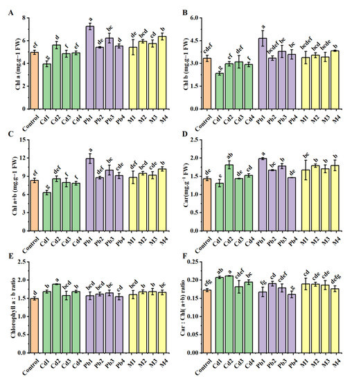 Photosynthetic pigments of B. racemosa under single Cd/Pb and Cd + Pb combined stress. (A) chlorophyll a (mg g−1 FW); (B) chlorophyll b (mg g−1 FW); (C) chlorophyll a + b (mg g−1 FW); (D) carotenoid (Car, mg g−1 FW); (E) chlorophyll a:b ratio; (F) Car:Chl (a + b) ratio. Means represent the average of three replicates (n = 3) ± SD, within each graph, mean values with common letters are not significantly different at p ≤ 0.05 according to Duncan’s multiple range tests.
