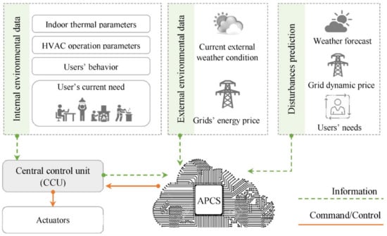 The use of various prediction models to estimate energy consumption based on various parameters in building and HVAC system designs could help us to determine the optimum parameters for reducing energy consumption [69,70,71]. Meanwhile, new integrated designs that implant programmed control systems are very efficient in developing energy-efficient HVAC systems in buildings [33,72,73]. Smart technologies could be predictive/responsive/adaptive against weather, users, grids, and other variables. The use of these smart technologies in buildings and HVAC systems could reduce energy and cost remarkably [7,73] (Figure 2). Figure 3 presents the managing level of adaptive–predictive control strategies in the smart building through a cloud platform. Cloud technology provides additional benefits and functions to the system, and the local controller could still manage the control in case of disconnection.