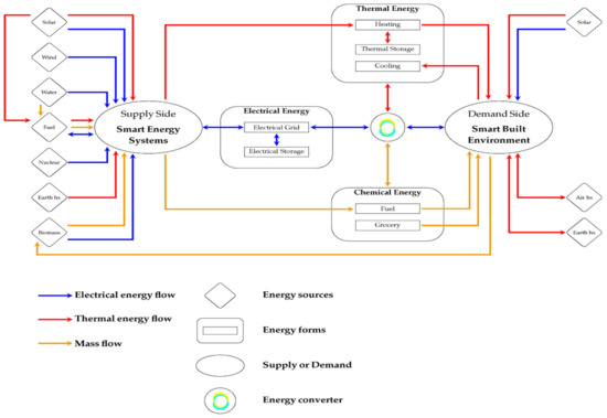 The progress in artificial intelligence provides a lot of opportunities for developing a smart built environment (SBE) and smart energy consumption. Figure 4 presents the energy flow charts between the supply side of smart energy system (SES) categories and the demand side in the SBE [74]. In the SBE, the use of nonrenewable energy sources reduced greenhouse gas emissions and cost considering the provision of a more sustainable built environment. Su [74] presented some methodologies, system optimizations, and holistic designs for developing SESs and discussed future challenges that require attention. Based on the presented macroscopic view, the fraction of energy can be optimized when the control of the transient fraction of power is adjusted properly. The optimization of the transient fraction of power from different energy forms needs to be considered based on the trade form between the supply side of SESs and the demand side of the SBE.