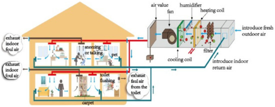 IAQ in buildings, such as temperature, humidity, airflow, and cleanliness, is directly related to HVAC systems and is considered the respiratory system of buildings [82]. However, improperly designed or operated HVAC systems could contain and develop various microbial contaminations and cause serious health issues for occupants. Recently, various outbreaks of severe epidemic diseases, such as COVID-19, SARS, MERS, and H7N9, and the importance of controlling the spread of various microbial contaminations in HVAC systems, have become critical subjects to consider in the sustainability development of such systems. The microbial contaminations could have been generated in different ways, such as by people (talking/sneezing), pets, carpets, and toilets (Figure 5). These viruses could survive and grow in various HVAC components, such as air ducts, filters, heat exchangers, and fan coils because of their suitable environmental conditions for microbial contaminations [82].