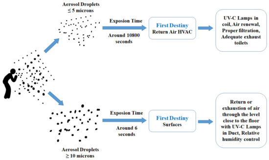 Santos et al. [87] studied various strategies to minimize the risk of COVID-19 infection within the indoor environment through an HVAC system design. They concluded that UV-C lamps, pressure control, air renewal and filtration, restroom actions, and humidity control are effective strategies for minimizing the transmission of airborne infections within the built environment (Figure 6).