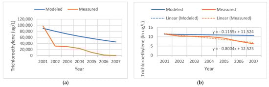 Comparison of the tricholorethylene (TCE) levels modeled (blue) versus measured (red) at a remediated site. (a) TCE levels in ug/L. (b) Natural log (ln) of TCE levels.