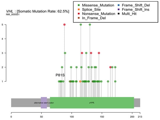 Based on prior reports of a TCE-linked hotspot mutation in the kidney, we assessed the hypothesis that variations in the Von Hippel Lindau (VHL) gene are associated with residential TCE exposure estimates. We observed only a single tumor with a P81S mutation at the reported hotspot (Figure 3). We found no significant increases in the proportion of tumors with any VHL mutation among patients with a history of residential TCE exposure based on our models (62.5% of those with residential TCE exposure history had a VHL mutation vs. 58.3% without exposure, p = 1.0).