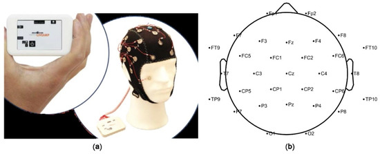 Brain Products (LiveAmp) in the experiment. (a) Brain Products (LiveAmp) with 32 channels; (b) The electrode position of international 10–20 system with 32 channels.