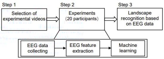 The measurement of brain activity is an objective way of assessing the physiological perception of engagement with the landscape, environment, or other objects [23,24,25]. Brain imaging is helpful to measure the effects of unconscious stimuli [26,27]. EEG frequency features have commonly been used in EEG signals. Generally, the frequency range of high amplitude signals observed is different when subjects are in calm state and when they are in a stimulated state [28,29]. EEG features (frequency domain features, time domain features, and spatial domain features) in EEG signals represent the brain region activities. With the continuous development of neuroscience and the trend of interdisciplinarity, thus far, there have been many studies using EEG technology and machine learning for recognition with good classification accuracy, e.g., emotion recognition [30,31,32,33], object structure recognition [34,35], color recognition [36], landscape and animal image recognition [37]. Some studies have gradually applied EEG technology to different fields, including environmental perception and landscape assessment [38,39,40,41], while others have also explored the impact of specific environmental characteristics on the natural environment [42,43,44]. Therefore, this study combines the experimental technology of neurology and UAV aerial video to identify and classify the landscape types from the perspective of human perception and compares the advantages and disadvantages of different classification features and classification methods.