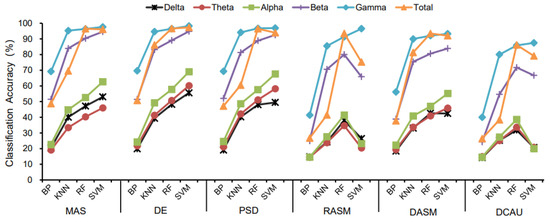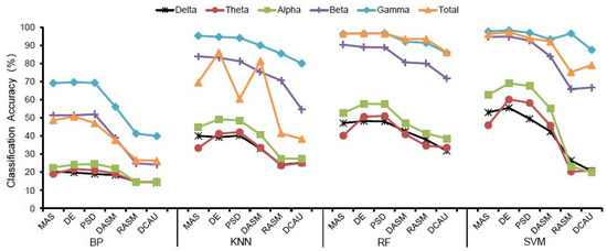 In the BP, KNN and SVM classifiers, the classification accuracy of the gamma band and beta band was higher than that of the total band based on EEG features such as MAS and PSD. The classification accuracy of the gamma band was higher than that of the total band based on EEG features including DE, DASM, RASM, and DCAU. In the RF classifier, there was little difference between the classification accuracy of the gamma band and the total band.