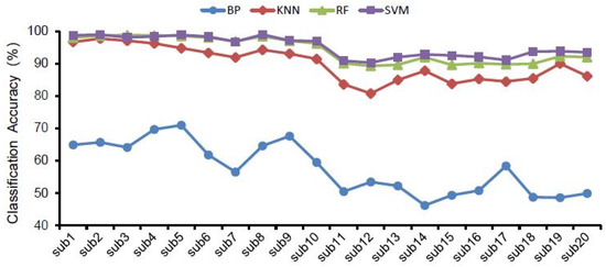 The classification accuracy of the four classifiers for different landscape types are displayed in Table 2 and Figure 4. For all EEG features, the SVM classifier and RF classifier had the highest landscape recognition accuracy, followed by KNN, and BP had the lowest classification accuracy among the four classifiers. Meanwhile, Figure 5 shows the highest classification accuracy of different classifiers in 20 groups of subjects in all bands of brain waves, and also shows that the classification accuracy of SVM and RF was higher than that of KNN and BP.