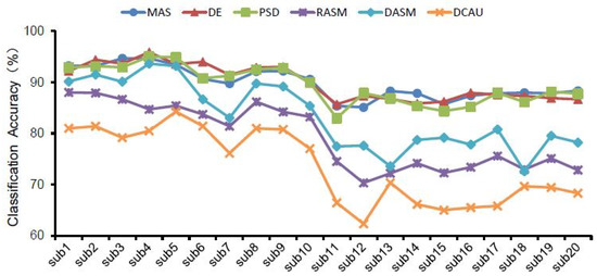 In general, for the same brain waves and the same classifier (Table 2 and Figure 6), the classification accuracy of frequency domain features including MAS, PSD and DE was higher than that of spatial domain features including DASM, RASM and DCAU indicators among the six EEG features selected. Furthermore, Figure 7 shows the maximum classification accuracy of different EEG features in 20 subjects in different waves, and also demonstrates that the classification accuracy of frequency domain features is higher than that of spatial domain features.