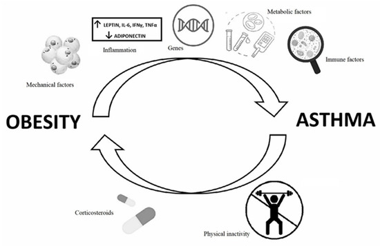 Obesity may contribute to the pathogenesis of asthma due to mechanical (changes in airway mechanics), inflammatory (atopic VS non atopic inflammation, cytokine imbalance), genetic (genomic profile differences), metabolic (insulin resistance and decreased response to inhaled steroids) and immune factors (microbiome). It seems that physical inactivity and systemic steroid therapy could have a role in increasing the risk of developing obesity in asthmatic children.