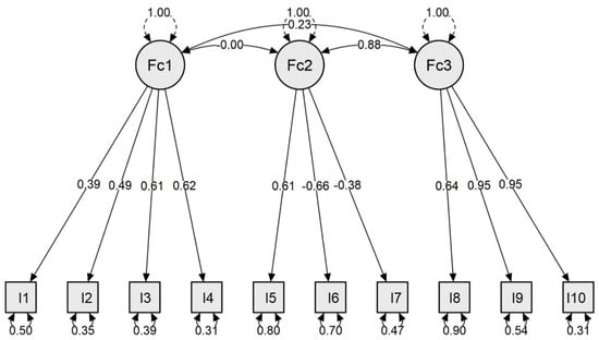 The resulting model derives from the solution obtained in the CFA based on the first examination (CFA), undergoing adjustments in the included items (based on their factorial load) and their organization within the factors (based on the theoretical dimensions), as indicated in the next section on data analysis. Thus, the model derived from this first analysis was tested, which is made up of three factors. Of the 17 items that were integrated into the three factors, ultimately 10 of these were included in the confirmed model since a satisfactory adjustment solution was obtained. Likewise, a unidimensional model was estimated that presented worse fit indices χ2 = 1470.675, p < 0.001, root mean square error of approximation (RMSEA) = 0.164 (95% CI: [0.15, 0.18]), comparative fit index (CFI) = 0.60, goodness of fit index (GFI) = 0.77, Bentler-Bonett non-normed fit index (NNFI) = 0.50, and standardized root mean square residual (SRMR) = 0.15. Consequently, based on the results obtained, the model of three correlated factors, made up of 10 items, was chosen to show better fit indices as detailed below.