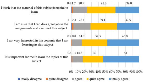 In relation to motivations, Figure 3 shows that around 70–80% of the students agree completely that the material of the subjects in this modality is functional, that the contents are interesting, that it is important to learn about them, that they will do well on papers and tests, and that they are concerned about their grades. This indicates that the ability to adapt to the online modality is explained by the perception that they have of the usefulness of the products and learning results being the motor of this adaptation to the latent concern in the students for overcoming the subject in the online modality.