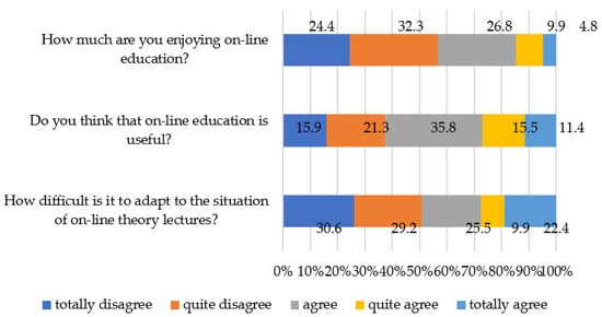 Finally, in relation to the digital pedagogy construct, all the items are at the medium–low threshold. In particular, the item “How difficult is it to adapt to the situation of online theory lectures?” (average = 2.29), reports the students’ perception of a good ability to adapt to online teaching when what is carried out are online theoretical lectures, while the items “Do you think that online education is useful?” (average = 2.85) and “How much are you enjoying online education?” (mean = 2.38) show the disconnection of students toward the usefulness and enjoyment of online teaching.