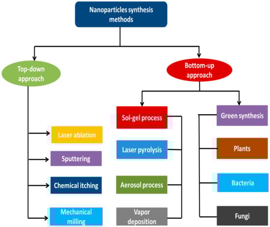 Silver nanoparticles (AgNPs) are synthesized using various physical, chemical, and biological techniques, which results in different shapes and sizes for use in numerous applications. These methods of synthesis are categorized into two main categories, namely “top-down” and “bottom-up” approaches. In the top-down approach, the size of silver metal in its bulk form is reduced mechanically to the nano-scale by using methods such as lithography, laser ablation, mechanical milling, etc. (Figure 1), whereas the bottom-up approach (self-assembly) involves the dissolution silver of salts in a solvent, reducing silver ions to their element with the use of a reducing agent, and then stabilizing the resulting neutral silver nanoparticles with stabilizing agents to prevent agglomeration [9,10]. A schematic diagram showing various top-down and bottom-up techniques for syntheses of silver nanoparticles is shown in Figure 1.