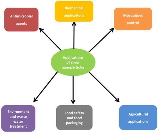 Silver nanoparticles have been found to have a wide range of applications as antimicrobials in biomedicine, in environment and wastewater treatment, mosquito control, agriculture, food safety and food packaging, and so many other applications. A schematic diagram showing some applications of silver nanoparticles is shown in Figure 2.