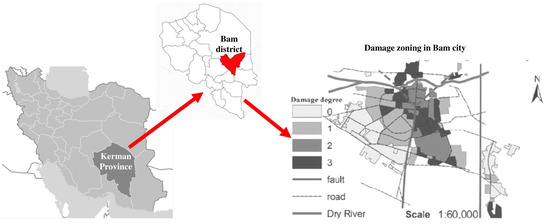 On 26 December 2003, a 6.7 magnitude earthquake hit Bam. A total of 142,000 people were affected, among whom more than 26,000 people died, approximately 30,000 people were injured, and 100,000 people were left homeless [9]. The Bam earthquake happened on a weekend at midnight and caused severe casualties, as people had limited time to escape [22]. The quake caused the destruction of 85% of the homes and city infrastructures as well as many commercial centers in the district [23]. The earthquake, with an epicenter depth of 10 km, resulted in minor damage in nearby villages; the most severely affected areas were located 15 km away from the epicenter [22]. Figure 1 shows the location of the Bam district in Iran and graphically shows the degree of damage caused by the earthquake in 2003.