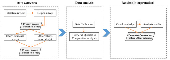 Generally, a QCA defines which factors/combination of factors might affect the results [21]. The application of QCA in SNDR projects enables the researchers to identify where, when, and under what circumstances projects can be conducted successfully [21]. However, three necessary steps should be completed before the application of QCA. First, the outcome(s) must be determined. The outcome is the objective or result (desirable or undesirable) of the procedure. Second, the conditions, which are the characteristics that affect the outcome(s), must be defined. Finally, the numerical values of the chosen outcomes and conditions are determined by constructing truth tables based on data collected from the selected cases [24]. The research steps of this study are graphically illustrated in Figure 2.