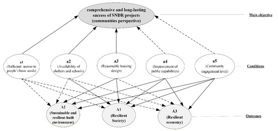 The solution for non-successful recovery showing two possible pathways covering all five unsuccessful neighborhoods is illustrated in Table 5. The solution’s coverage is 0.8, and its coverage is perfect. Improved public capabilities in coping with disasters (condition a4) is necessary for the outcome’s failure, although it is not sufficient. Unreasonable housing design (~a3), low public engagement (~a5), and shortage of shelters and schools (~a2) are highly sufficient, although their necessity score is lower than 0.9 (sufficiency of ~a3 = 0.97, sufficiency of ~a5 = 0.98 and, sufficiency of ~a2 = 0.98).