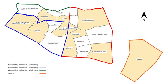 Next, the community-based success evaluation model for SNDR projects was applied to neighborhoods affected by the 2003 Bam earthquake. The data were collected through structured interviews with households in 11 neighborhoods in Bam city and Baravat. Since Bam was reconstructed by dividing it into several districts assisted by different provinces, the neighborhoods were selected according to the damage zoning map after the earthquake and we attempted to cover various sections governed by each of three municipalities in Bam. Moreover, Baravat was chosen because of its proximity to Bam city (almost 10 km) and the high level of destruction caused by the earthquake. Figure 4 shows the chosen neighborhoods (colored districts) where the public survey was conducted.