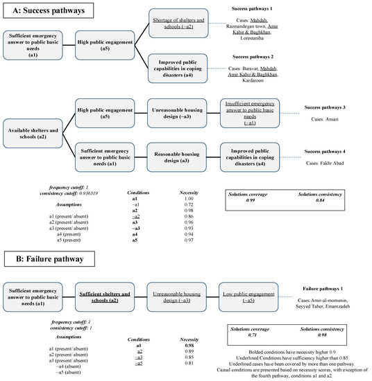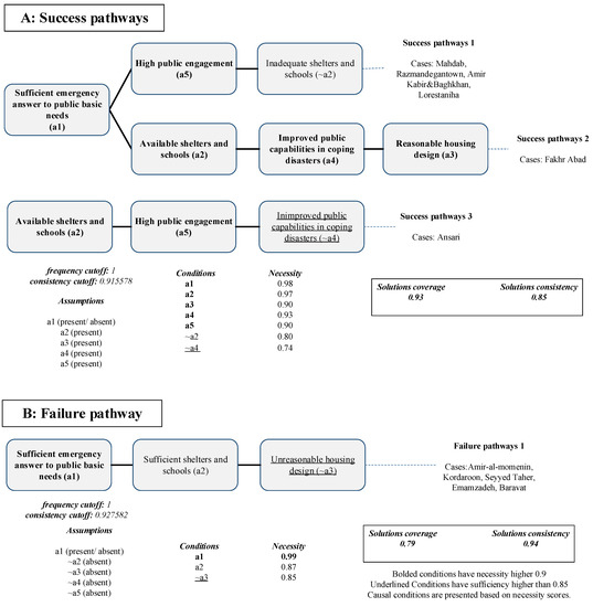 Amir-al-momenin, Seyyed Taher, and Emamzadeh were the unsuccessful neighborhoods that failed to achieve outcome A2. These neighborhoods all presented one pathway. Sufficient emergency response to basic public needs (condition a1) and sufficient shelters and schools (condition a2) were the only necessary conditions observed in the failure pathway. At the same time, the latter condition also gained high sufficiency (sufficiency = 0.91). The presence of individual conditions such as unreasonable housing design (~a3) and low public engagement (~a5) guaranteed failure, since their sufficiency was high (sufficiency of ~a3 = 0.97 and sufficiency of ~a5 = 0.99).