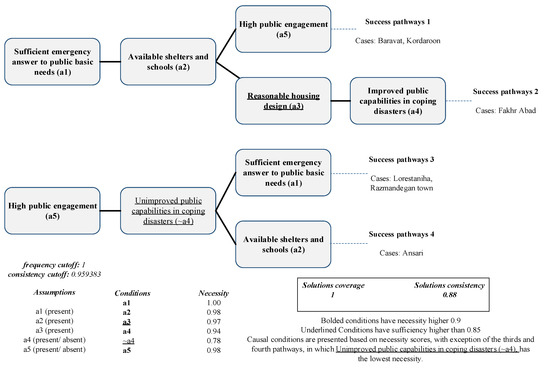 The simultaneous presence of sufficient emergency response to basic public needs (condition a1) and high public engagement (condition a5) were observed in the first and third pathways. While Baravat and Kardaroon residents had adequate access to safe shelters and education after the earthquake (condition a2), Lorestaniha and Razmandegan neighborhoods demonstrated low improvement in public capabilities to respond to a disaster (~a4), since most residents were not provided with disaster training. However, all four neighborhoods have successfully achieved the ultimate outcome indicating the necessity of considering the different combinations of the mentioned conditions.