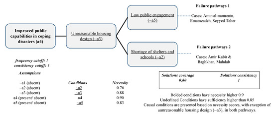 In addition, the Fakhr Abad neighborhood presented the second pathway, which revealed that a resilient society can be achieved if the community receives adequate assistance in the emergency, transitional, mid-term, and long-term stages of recovery. It is quite surprising that reasonable housing design was only presented in the second pathway. Although it gained high necessity, it did not reach a high sufficiency score (necessity = 0.90 and sufficiency = 0.84). However, its absence is significantly sufficient to fail to achieve a resilient society, although not necessarily leading to the failure (necessity = 0.85 and, sufficiency = 0.91). The failure pathway of outcome A1, presented in Figure 4 was present in all unsuccessful neighborhoods. Sufficient emergency response to basic public needs (conditiona1) is the only necessary condition for failure whose combination with sufficient shelters and schools (condition a2) and unreasonable housing design (~a3) resulted in failure in outcome A1.