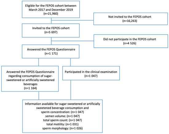 Men eligible for participation in the FEPOS cohort were born between 1998 and 2001 to mothers in the DNBC and lived near Aarhus or Copenhagen at the time they turned 18 years and 9 months of age (n = 21,960). Between March 2017–December 2019, a total of 5697 men were selected and invited to participate in the FEPOS cohort []. Invited men were encouraged to decline participation if they had a medical history of cryptorchidism, sterilization, or chemotherapy. They filled out a comprehensive online questionnaire to provide in-depth information on diet and health behavior, and information on several anthropometric characteristics, including heigh and weight. In addition, the men delivered a semen sample, a blood sample, and a urine sample. In total, 1047 (19%) participated in both the FEPOS questionnaire and the clinical examination, and had semen characteristics measured, see Figure 1.