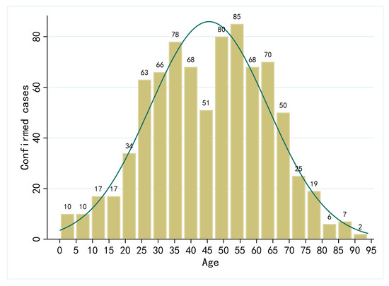 The average age of all confirmed cases was 45.51 years old, with the youngest one only 1 month old and the oldest one 94 years old. Figure 1 shows the age distribution of all confirmed cases.