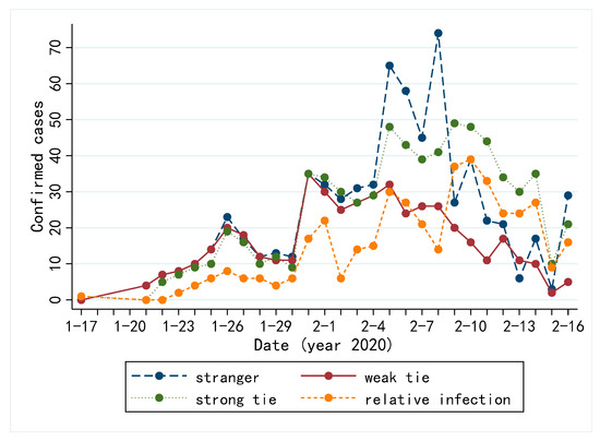 We further analyzed the transmission route of COVID-19 among all confirmed cases. Figure 2 illustrates the trend of infection route over time. In addition to the three social ties, the family member infection route is also depicted. A higher proportion of cases are infected through stranger ties and strong ties.