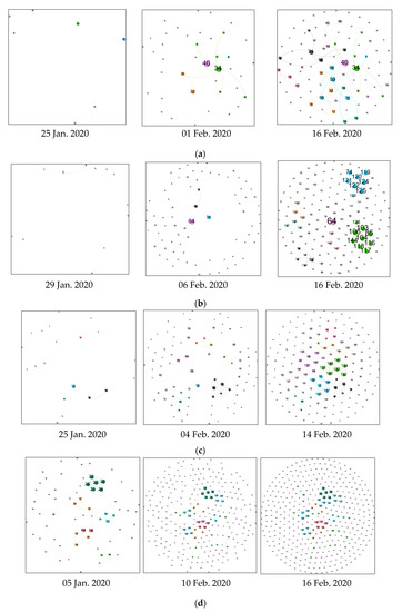 Figure 3 shows the dynamic contact networks in all the eight regions. As can be seen, in the early period, the contact network is sparse, indicating that at early stage the outbreak was dominated by individual infection rather than chain infection. After February 2020, some clusters gradually appeared, which indicates that mass infection emerged over time. In Heilongjiang Province, for example, the first confirmed case was reported on 23 January 2020, and there were only three cases until 31 January 2020. By the middle of the period (5 February 2020), however, the number of confirmed cases in Heilongjiang Province suddenly surged, with 56 new cases confirmed on that day, resulting in a total of 68 cumulative confirmed cases. At the same time, there were several clusters of mass infection. In many provinces, the largest cluster usually included people staying or passing by Wuhan, such as case No. 34 in Gansu Province, case No. 64 in Guizhou Province, case No. 52 in Inner Mongolia, case No. 138 in Yunnan Province, and case No. 26 in Heilongjiang Province.