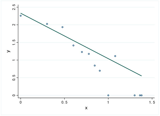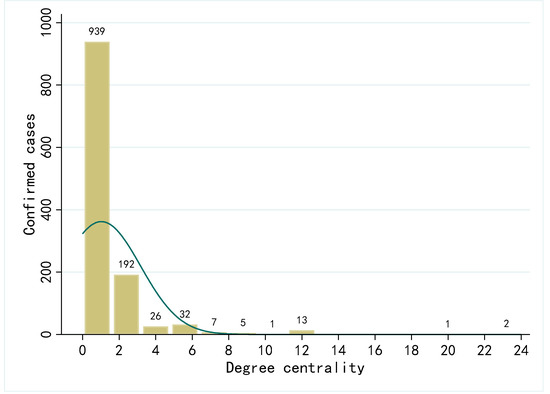 Based on the centrality values in the network, we test whether the degree centrality distribution is in accordance with the power law distribution by fitting the logarithm of degree and frequency [63]. The results are shown in Figure 5. The slope of the fitting line is −1.29 and the goodness of fit (R-Square) is 0.855, which indicates that the degree distribution is consistent with the power law. This implies that the contact network of confirmed cases is a scale-free network, in which only a few nodes have a high degree centrality and most nodes have a low degree centrality. As Meyers et al. pointed out, the spread of disease is particularly not serious in scale-free networks [40]. In addition, there were 17 cases with degrees greater than 10. Given cases with high degree centrality, timely quarantine and medical treatment is key to interrupt further spread of the epidemic.