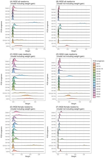 Distributions of importance weights of PCB congeners in WQS models (value range: 0–1, A larger value suggests that it is more important in the model). Distributions of importance weights were generated based on importance weights for each congener in 100 WQS models calculated based on multiple imputed data ((A): all newborns, model including weight gain, (B): all newborns, model not including weight gain, (C): male newborns, model including weight gain, (D): male newborns, model not including weight gain, (E): female newborns, model including weight gain, (F): female newborns, model not including weight gain).