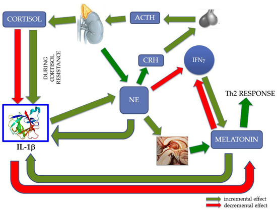 Interplay between central nervous system, endocrine system, and immune system. Under physiological conditions, norepinephrine (NE) activates the HPA axis and determines the production of cortisol that, in turn, downregulates the production of IL-1β. During chronic stress and especially a glucocorticoid-resistant state, the increment of IL-1β transforms this inflammatory signal into a nervous signal: NE. In turn, NE uses the endocrine system (melatonin and cortisol) to rebalance IL-1β, but this control cannot function under cortisol resistance. NE eventually induces a skewing of the immune response, with a reduction in interferon gamma (IFNγ) and T helper 1 (Th1) activation, and an unbalanced T helper 2 (Th2) response. Other abbreviations: corticotropin releasing hormone (CRH); adrenocorticotropic hormone (ACTH). The protein structure of Interleukin 1β (IL-1β) was taken from the RCSB-protein data bank (www.rcsb.org, accessed date 15 February 2020 [17].