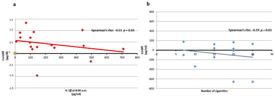 Correlations of IL-1β with Cortdiff and number of cigarettes. (a) The negative correlation between IL-1β levels at 8:00 a.m. (pg/mL) and Cortdiff (μg/dL) is shown with a Spearman’s rho = −0.51 and p = 0.03. (b) The negative correlation between IL1diff and number of cigarettes is shown with a Spearman’s rho = −0.19 and p = 0.03.