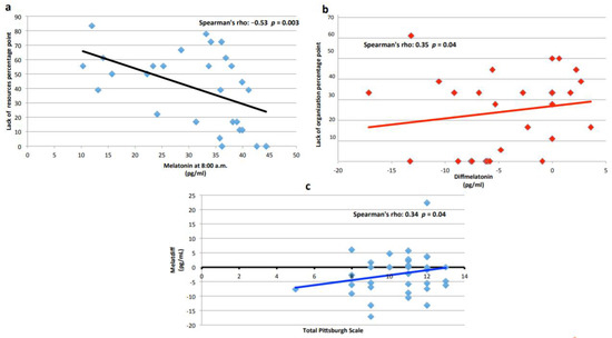 (a) Correlation of melatonin with subclasses of PSS and total PSQI score. The negative correlation of melatonin levels at 8:00 a.m. (pg/mL) and the PSS subclass “lack of resources” is shown with a Spearman’s rho = −0.53 and p = 0.003. (b) Positive correlation of Melatdiff (pg/mL) and the PSS subclass lack of organization is shown with a Spearman’s rho = 0.35 and p = 0.04. (c) The positive correlation of Melatdiff (pg/mL) and total PSQI score is shown with a Spearman’s rho = 0.34 and p = 0.04.