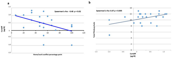 (a) Correlation of cortisol with the home–work conflict subclass and total PSQI score. The negative correlation between Cortdiff (μg/dL) and the PSS subclass home–work conflict is shown with a Spearman’s rho = −0.48 and p = 0.02. (b) The positive correlation between Cortdiff (μg/dL) and PSQI score is shown with a Spearman’s rho = 0.47 and p = 0.005.