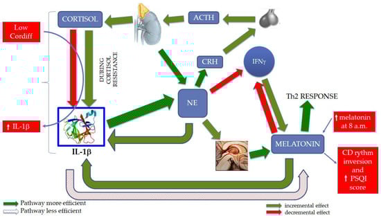 Verification of our hypothesis of the relationships between cortisol, IL-1β, and melatonin. Results obtained in a fishermen cohort subjected to chronic stress show that low Cortdiff is associated with higher IL-1β levels, while increased melatonin levels at 8:00 a.m. are associated with circadian (CD) inversion and higher PSQI scores, i.e., sleep disturbances. The dotted arrows hypothesize the relationship between increased IL-1β levels, NE, and melatonin occurring in fishermen, in particular the more efficient pathway stemming from IL-1β, increasing NE and, eventually, melatonin. This pathway would overcome the less efficient direct inhibitory pathway of IL-1β on melatonin. Other abbreviations: norepinephrine (NE); interferon gamma (IFNγ); T helper 1 (Th1); T helper 2 (Th2); corticotropin releasing hormone (CRH); adrenocorticotropic hormone (ACTH); interleukin 1β (IL-1β); circadian rhythm (CD); Pittsburgh Sleep Quality Index (PSQI); the difference between cortisol at 8:00 a.m.–cortisol at 2:00 p.m. (Cortdiff).