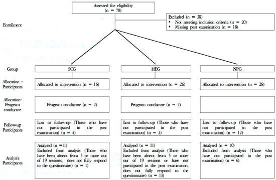 Hence, a nonparametric test was performed for statistical analysis before program implementation, and the Kruskal–Wallis test was performed on the data collected to test the homogeneity between groups using the SPSS Win.23.0 program. To test the between-group effects on the post-intervention values, the Kruskal–Wallis test and Bonferroni correction post hoc test were performed for the homogeneous items in the pre-test. The baseline-adjusted analysis of covariance (ANCOVA) and Bonferroni correction were performed as post hoc tests on the non-homogeneous items. For within-group pre–post comparisons, the Wilcoxon signed-rank test was used.