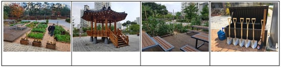 The SCG program was implemented in the community garden within the I apartment located in J city. There are 44 garden beds measuring approximately 4 m2 in empty spaces around the management office and the entrances of some buildings. Pergolas, chairs, tables, irrigation systems, and gardening tool storage boxes were provided, and the paths were paved with bricks (Figure 2). Apartment community facilities (the library and senior citizen hall) were used for indoor activities.
