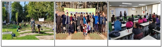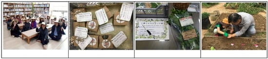The HEG program was implemented in the community garden of the J apartment complex located in S city, Korea. There are 30 garden beds each measuring 5 m2 on the edge of the complex, adjacent to the apartment management office. Chairs, irrigation systems, and gardening tool storage boxes were provided, and the paths between the garden beds were covered with grass (Figure 4). The community welfare center, an apartment community facility, was used for indoor activities.