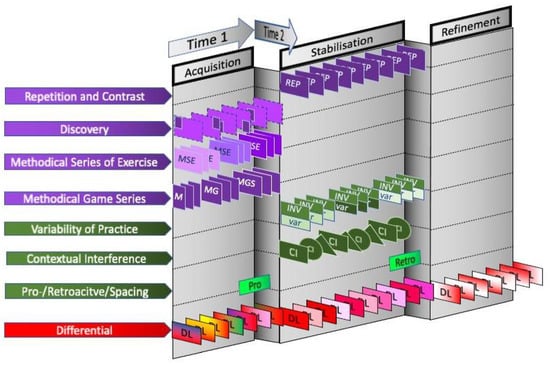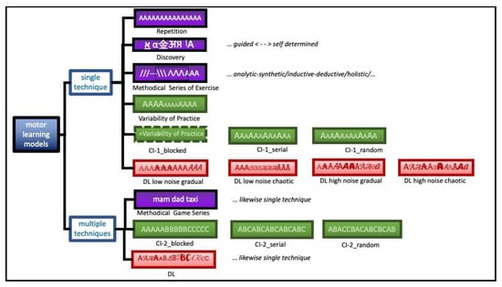 For delineation within the frame of the GeMoT, the most common motor learning models used in sport pedagogy, physical education, sport psychology, and sports science were included. The inclusion criteria were that the models had to contribute innovations for their time and had to lead to obvious changes in the content or sequence of physical exercises. The models can be coarsely described as a historical collection of physical search strategies to solve specific movement problems [65,66,67] and are distinguished here from more mental approaches that focus on exclusively cognition-oriented criteria (e.g., motivation, stress, anticipation, or emotional issues in learning), knowing that these groups cannot be separated in real terms. The terms “motor learning,” “coordination learning,” and “skill acquisition” are used interchangeably. However, from the perspective of pedagogy, teaching and learning fundamentally differ from each other, not only in perspective but also in the contribution being limited exclusively to the dominant movement-related approaches that are momentarily led by sports psychologist approaches. Going back to the roots of pedagogy in Greek philosophy, learning has always been related to self-activity and discovery. However, learning psychology and, subsequently, sport psychological learning research, due to its scientific orientation in connection with the after-effects of behaviorism, increasingly restricted itself to the optimization of measurable behavior through visual, auditory etc. stimuli. Although for a long time—at least in continental European sports pedagogy—the question of “what?” was the central object of this education in school, the question of “how?” increasingly moved to the center of interest in the context of the Cold War. Both foci resonate in the discussion between motor learning researchers and physical education teachers. While sports pedagogues or physical education teachers mainly hold compulsory lessons and always pursue multiple teaching goals in parallel, with motoric goals being one aspect alongside the cognitive, social, affective, and other goals, the sports coach rather deals with volunteers who agree to the goal of motoric performance improvement. However, as performance levels rise, athletic trainers become increasingly aware of goals for the athlete that go beyond purely motor goals that are associated with psychology, sociology, nutrition, lifestyle, injury prevention etc.