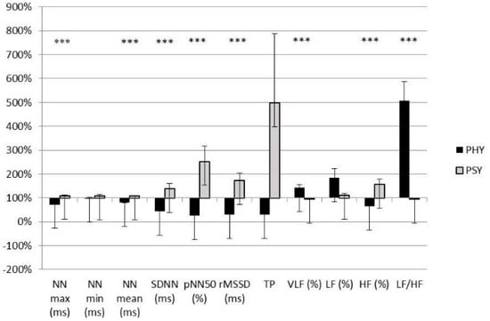 The different trends of HRV parameters between the physical (PHY) and psychological (PSY) stress tests (mean ± standard error of mean; ***: p < 0.001). The measurement of changes is expressed in percentages on the vertical axis. Abbreviations: see Table 1.