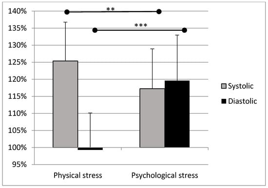 The changes in heart rate variability and blood pressure are two of the many cardiovascular responses of the human body to acute stress. The presence of a cardiovascular response does not require extreme stress [18]. The results of blood pressure data concur with the findings of Holland et al. [25], Instebø et al. [26], and Schultz and Sharman [27], since for the physical stress test only the systolic blood pressure increased, whereas for the psychological stress test both the systolic and diastolic values increased significantly. Lee at al. [24] found that all HRV parameters were associated with the changes in systolic blood pressure. We did not find any correlation between blood pressure and HRV values for either the physical or the psychological stress tests—neither among resting nor delta values. Wang et al. [34] analyzed the effect of a mental arithmetic task on blood pressure. The elevation of blood pressure that regularly occurs as a response to stress is most likely due to the increased sympathetic–adrenal–medullary activities; along with this, there is always an increased state of anxiety and tension. The observed changes in systolic and diastolic blood pressure between the pre- and post-test measurements are considered normal, and were expected to change accordingly. During physical stress, the aim of blood flow redistribution is to serve the increasing demands of working muscles. Higher flow velocity is necessary in order to increase cardiac output, which requires higher systolic blood pressure. Peripheral vascular resistance decreases because the capillary bed dilates to help the circulation redistribution, which results in decreasing diastolic blood pressure. Under psychological stress, adrenaline and noradrenaline cause vasoconstriction through the α1-adrenergic receptor, which increases both the systolic and diastolic blood pressure. Despite the different methods of psychological stress employed, our results confirm the findings of Wang et al. [34].
