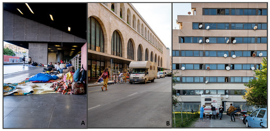Study area: informal settlement of Rome: (A) Tiburtina station, homeless migrants living near the station entrance; (B) Termini station, MEDU’s mobile clinic parked near the station during the weekly assistance activities; (C) Collatina’s settlement, MEDU’s staff positioned at the foot of the building just before the weekly assistance activity. Photographs by Odino Vignali.