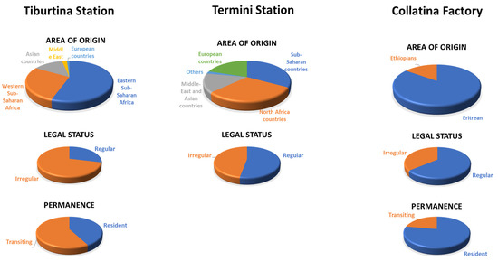 Population characteristic of the informal settlement of Rome. Area of origin, legal and permanence status vary depending on the type of settlement. Tiburtina settlement is made up mostly of transiting irregular migrants from sub-Saharan Africa. Termini station has a greater variability regarding the country of origin and the legal status of the population. In this settlement, visits were made only on the resident population. In Collatina, population comes from Ethiopia or Eritrea, and there was a higher percentage of regular and permanently resident populations than the other two settlements.